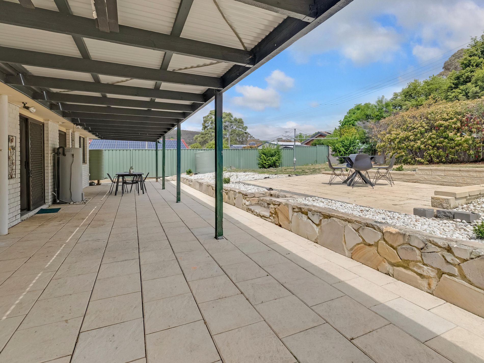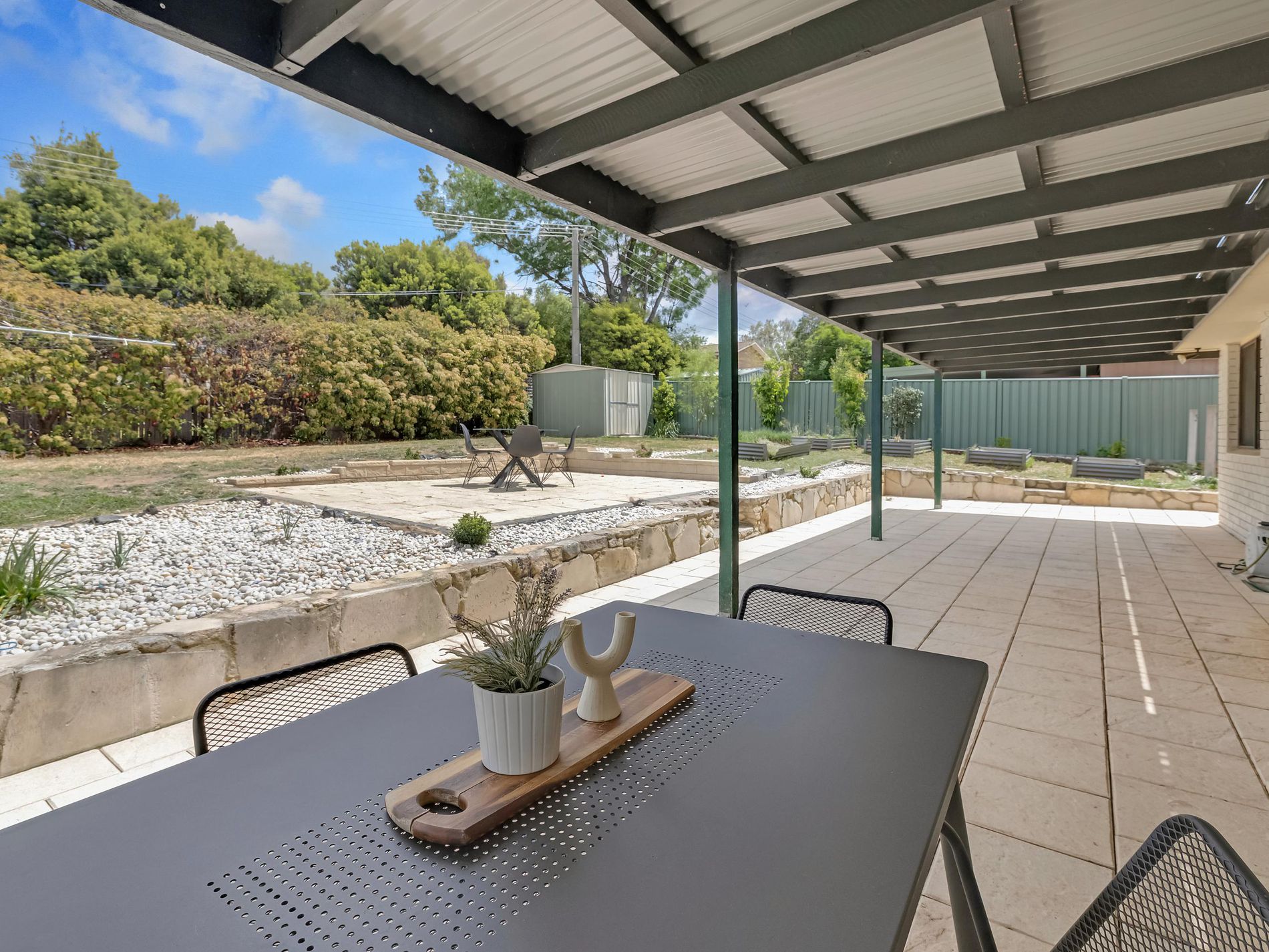 Outside, the large entertaining area is ready for BBQs, family dinners, or a quiet coffee in the morning light.